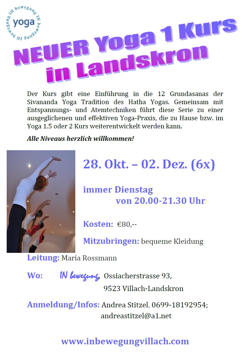 Im Herbst bieten wir ab 28. Oktober immer am Dienstag von 20.00-21.30 einen weiteren Yoga 1 Kurs für AnfängerInnen und WiedereinsteigerInnen an. Noch gibt es freie Plätze! Wer sich vor dem Ende diesen Jahres noch etwas Gutes tun möchte, ist herzlichst willkommen hineinzuschnuppern.