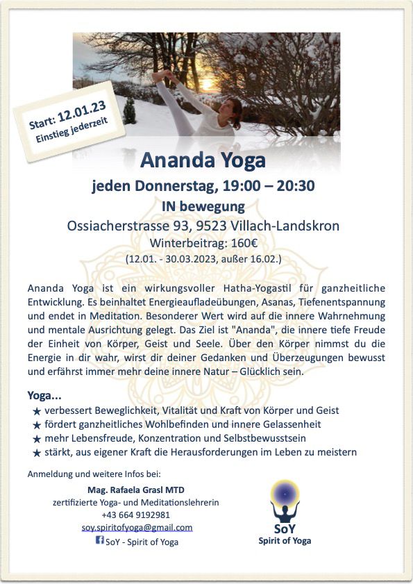 Ab 12. Januar gibt es ein neues Angebot bei IN bewegung: immer am Donnerstag von 19.00-20.30 ANANDA Yoga mit Rafaela Grasl. Ananda Yoga ist ein wirkungsvoller Hatha-Yogastil für ganzheitliche Entwicklung. Es beinhaltet Energieaufladeübungen, Asanas, Tiefenentspannung und endet in Meditation. Besonderer Wert wird auf die innere Wahrnehmung und mentale Ausrichtung gelegt. Das Ziel ist „Ananda“, die innere tiefe Freude