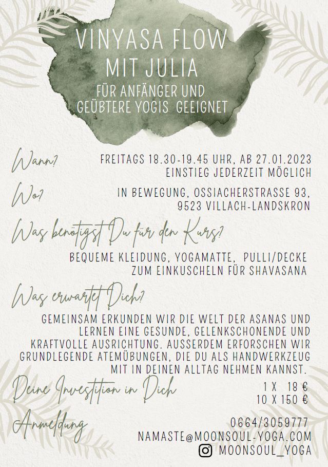 Vinyasa Flow ab Ende Januar von andreastitzel Veröffentlicht am Januar 7, 2023 Jetzt ganz neu gibt es bei IN bewegung auch am Freitag Yoga. Julia Stockreiter bietet ab 27.1.23 immer freitags von 18.30-19.45 Vinyasa Flow für Anfänger:innen und geübtere Yoginis an. Teilen mit: Klicke, um auf X zu teilen (Wird in neuem Fenster geöffnet) X Klick, um auf Facebook zu teilen (Wird in neuem Fenster geöffnet) Facebook Gefällt mir Wird geladen … Ähnliche Beiträge
