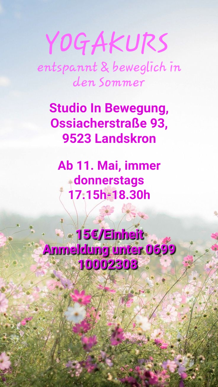 NEUer Yogakurs donnerstags 17.15-18.30 von andreastitzel Veröffentlicht am Mai 3, 2023Mai 3, 2023 Ab 11. Mai bietet Dani Trappl (Ausbildungen u.a. in Hatha Yoga, Power Yoga & Nuad) einen neuen Yogakurs bei IN bewegung an. Es gibt noch freie Plätze! Anmeldung direkt bei Dani Trappl unter: 0699 10002308 Teilen mit: Klicke, um auf X zu teilen (Wird in neuem Fenster geöffnet) X Klick, um auf Facebook zu teilen (Wird in neuem Fenster geöffnet) Facebook Gefällt mir Wird geladen … Ähnliche Beiträge