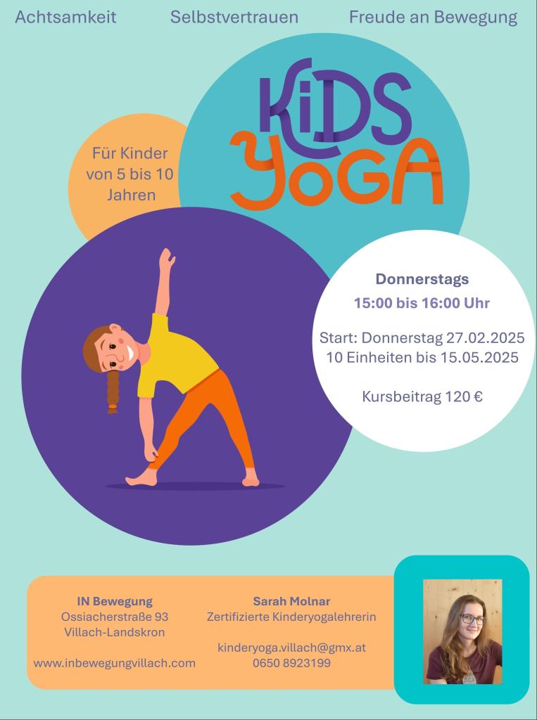 Kids Yoga von andreastitzel Veröffentlicht am Januar 9, 2025Januar 9, 2025 Ab 27. Februar gibt es bei IN bewegung auch wieder Yoga für Kinder von 5-10 Jahre. Achtsamkeit, Selbstvertrauen und Freude an Bewegung stehen im Vordergrund. Immer donnerstags, 15.00-16.00 Uhr. Teilen mit: Klicke, um auf X zu teilen (Wird in neuem Fenster geöffnet) X Klick, um auf Facebook zu teilen (Wird in neuem Fenster geöffnet) Facebook Gefällt mir Wird geladen … Ähnliche Beiträge